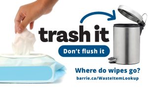 “flushable”–should never be flushed. Toilet paper is the only paper product that breaks down quickly in the wastewater system. Protect your home plumbing: wipes belong in the garbage.